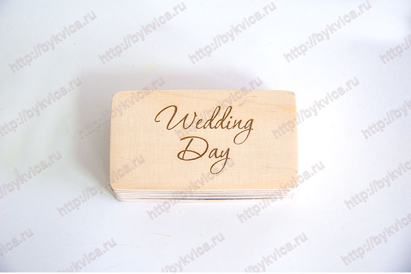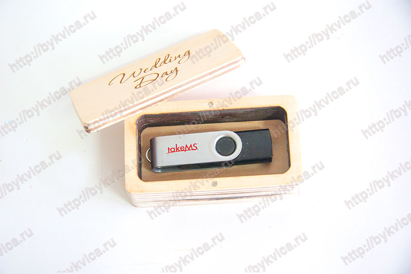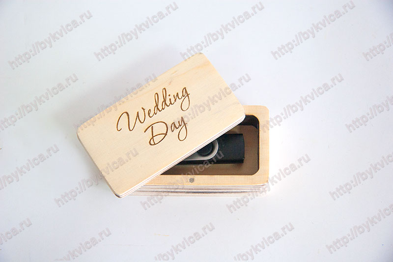 Коробка для флешки изготовлена из фанеры толщиной 6 мм. Коробка вырезана на лазерном станке. На крышке коробки нанесена лазерная гравировка «Wedding Day».Крышка крепится на магнитах. По Вашему желанию на коробку для флешки может быть нанесена любая надпись, логотип, рисунок.