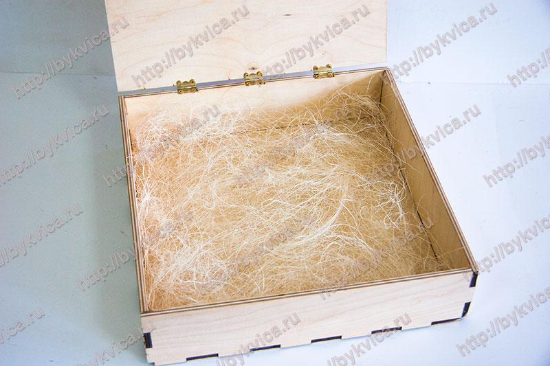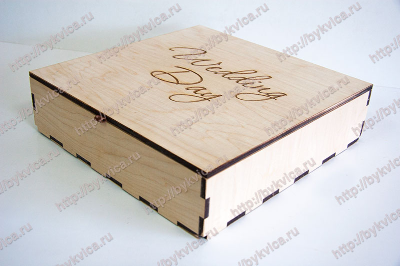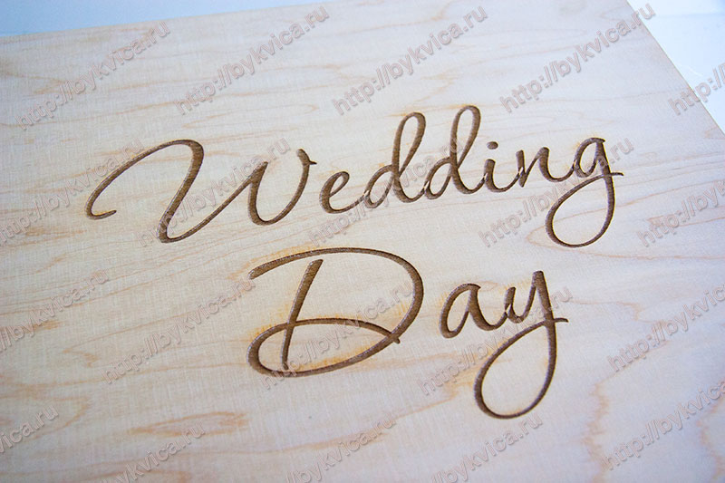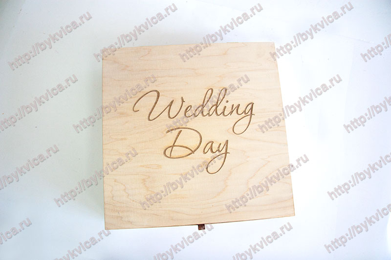 Коробка из дерева для свадебного альбома изготовлена из фанеры толщиной 6 мм. На крышке коробки нанесена большая надпись «Wedding Day». Во внутренней части коробка украшена сизалью. Так же на крышке находится кожаный хлястик для удобства открывания. На крышке расположен карман для флешки из кожи.