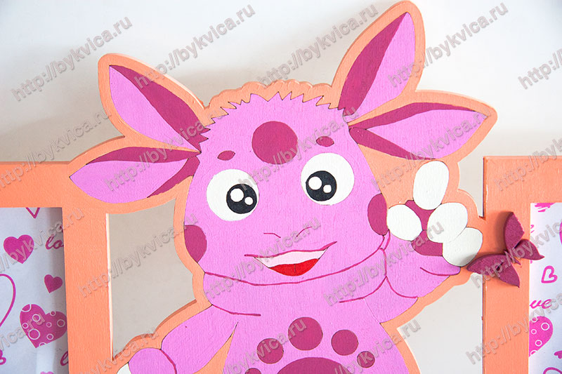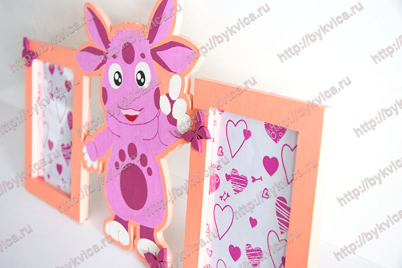 Рамка для детской фотографии изготовлена из фанеры толщиной 6 мм. Рамка изготовлена по оригинальному макету с использованием лазерной резки пол фанере и расписана вручную. Размер фото 10 см*15 см и 15 см.Фотографии защищены стеклом(акрилом). Рамка выкрашена в яркие цвета: оранжевый, розовый, красный. На рамке изображен популярный сказочный персонаж из детского мультика. Данная рамка станет отличным подарком для любого ребенка. По Вашему желанию рамка может быть выкрашена в другие цвета.