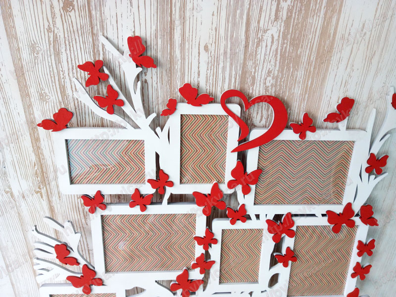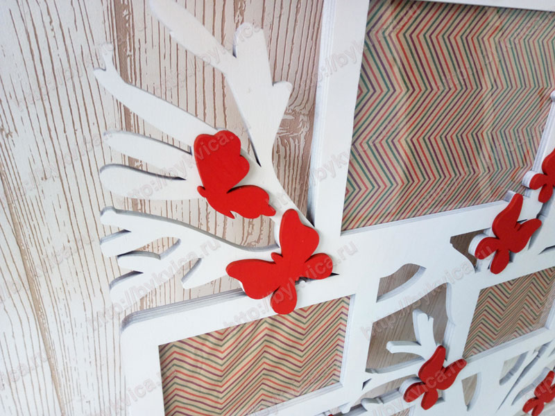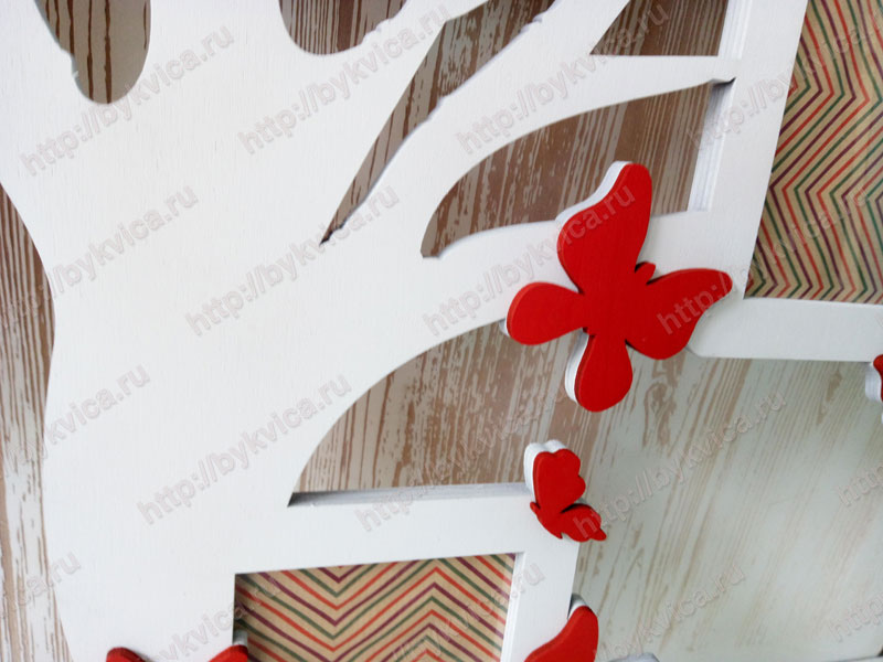 Рамка в виде дерева с бабочками и цветами. Большая настенная композиция для фотографий. Рамка изготовлена из нескольких слоев фанеры 6 мм. Рамка для фото выкрашена в белый цвет. Бабочки и другие элементы покрашены в ярко красный. Размер вставок для фотографий 10*15 см. Размер рамки в виде дерева 120*75 см. по Вашему желанию цвета рамки или элементов могут быть изменены. Так же советуем посмотреть другие рамки для фотографий. Для заказа просто нажмите на кнопку «Добавить в корзину» или «Купить в один клик».