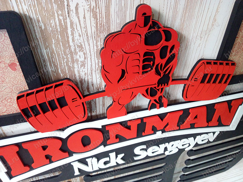 Медальница из дерева с крутым и очень ярким дизайном. Размер медальницы 90*60 см. В центре медальницы находится яркий силуэт Бодибилдера с рельефной мускулатурой. Под фигурой находится надпись в белой рамке «»IronMan». Цвет медальницы из дерева темно коричневый, цвет фигуры ярко-красный. Цвет надписи и имени спортсмена-белый. по Вашему желанию на медальнице может быть расположено любое имя или надпись. Так же и цвет медальницы может быть любой. Мы можем изготовить медальницу размером до 150 см.