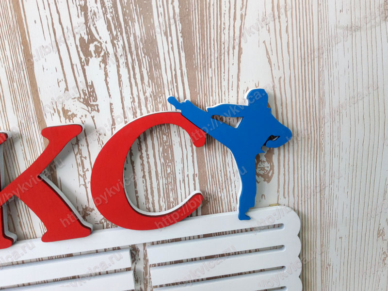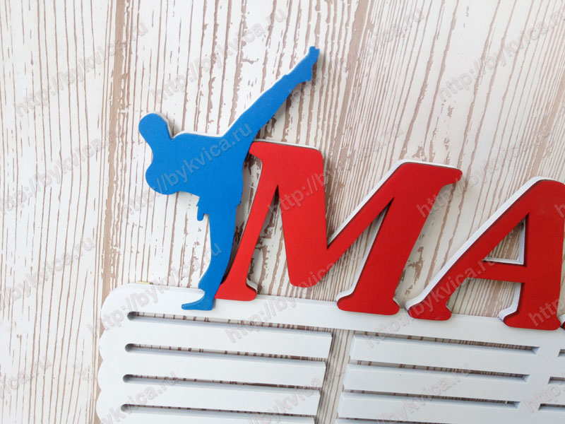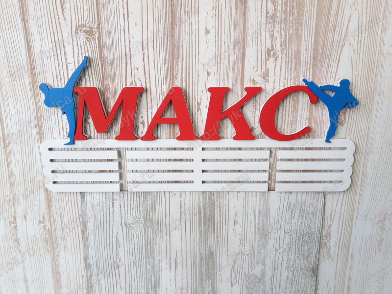 Медальница спортивная с именем из дерева «Макс». Медальница изготовлена из фанеры 6 мм. Цвет медальница: белый, синий, красный. Вы можете купить медальницу в таком исполнении или заказать медальницу с любым другим дизайном. Данная вешалка для медалей была изготовлена для каратэ. Для того чтобы заказать медальницу нажмите на кнопку «Добавить в корзину». Для того чтобы посмотреть другие медальницы перейдите в категорию «вешалки для медалей«.
