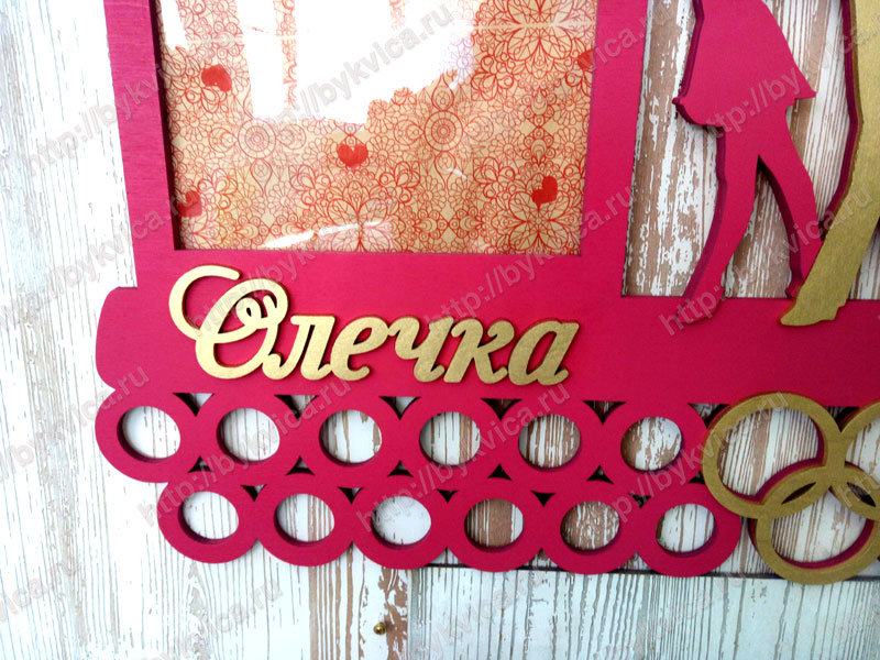 Держатель для медалей из дерева с надписью «Олечка Наша гордость». Держатель для медалей изготовлен из дерева по оригинальному макету. Медальница изготовлена из нескольких слоев фанеры 6 мм. Цвет держателя для медалей малиновый и золото. Сверху медальницы находятся рамки для фотографий и фигуры танцоров. Медальница может быть изготовлена с любым именем и надписью, цвет так же может быть любым. Для заказа держателя для медалей нажмите на кнопку «Добавить в корзину». Больше медальниц можно увидеть в разделе «Вешалки для медалей«.