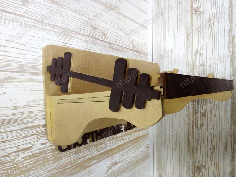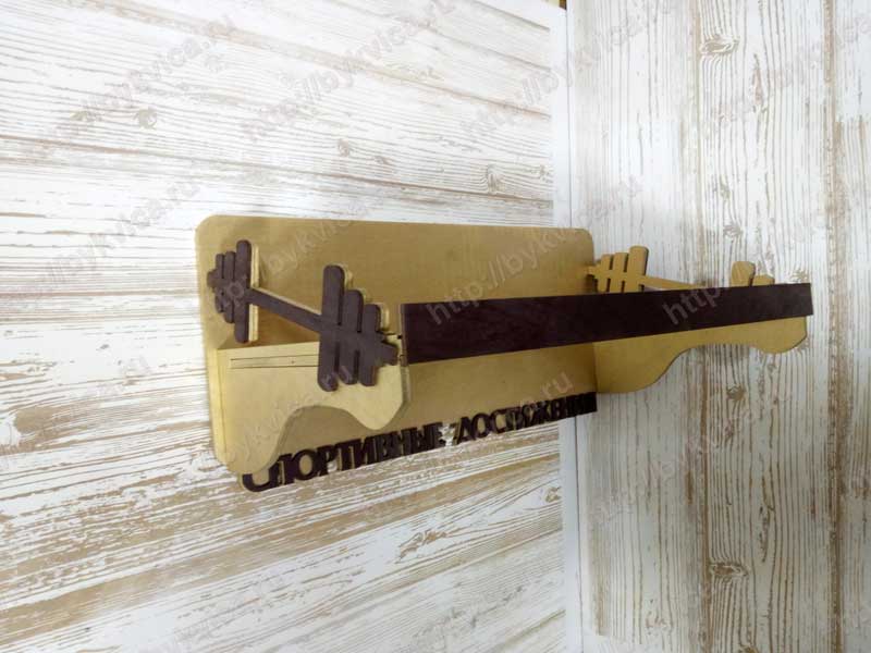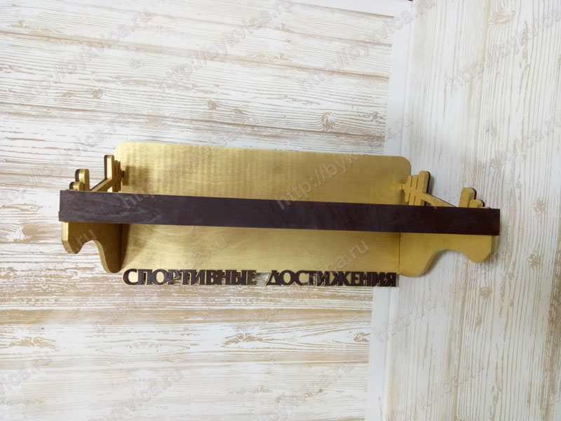 Полка для кубков и наград изготовлена из фанеры 6 мм( два слоя). Боковые стороны полки для кубков украшены силуэтами гантель. Внизу полки расположена надпись из дерева «Спортивные достижения». По Вашему желанию мы можем изготовить полку для кубков с индивидуальным дизайном. Так же Вы можете заказать у нас полку с подвесами для медалей.