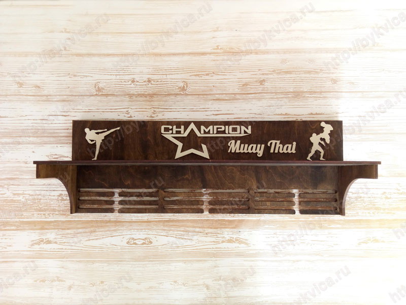 Полка для кубков и медалей из трех слоев фанеры 6 мм. Общая толщина 1,8 см. Размер полки для кубков и медалей 80*30 см. Полка поделена на два отдела: верхний предназначен для кубков, нижний-вешалка для медалей. Полку делали для вида спорта «Muay Thai». На полке размещены контуры бойца Muay Thai и надпись из дерева «Champion». Для того чтобы заказать полку для кубков нажмите на кнопку «добавить в корзину».